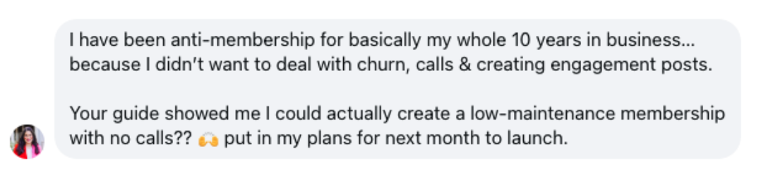 Your guide showed me I could actually create a low-maintenance membership with no calls?? put in my plans for next month to launch.